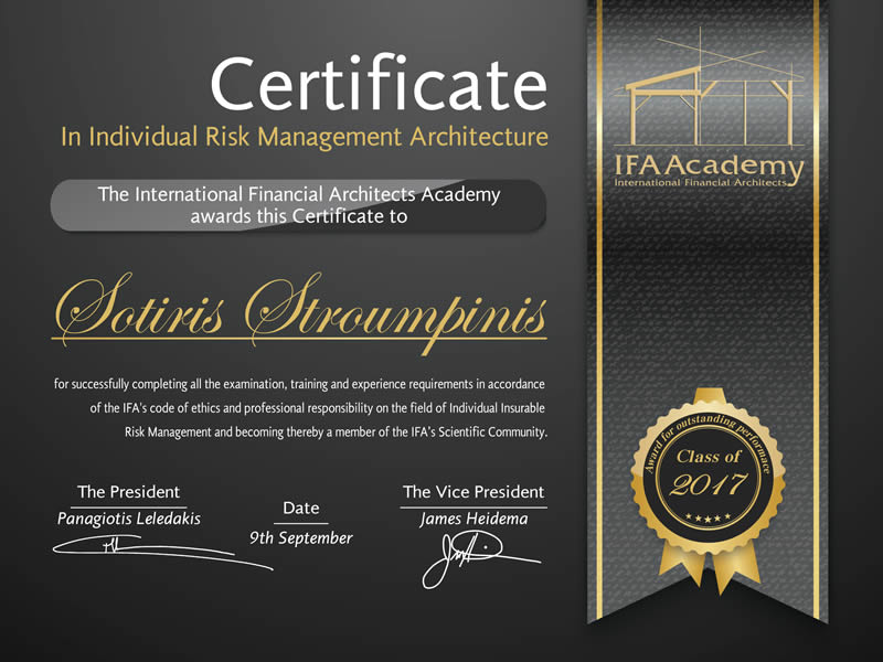 Πιστοποιημένοι στη χρήση του ειδικού λογισμικού συστήματος Individual Risk Management Architect – IRMA του εξειδικευμένου οργανισμού IFAAcademy, προσφέρουμε απόλυτα εξατομικευμένες, επιστημονικές μελέτες διαχείρισης ασφαλίσιμων κινδύνων για κάθε πολίτη και οικογένεια.